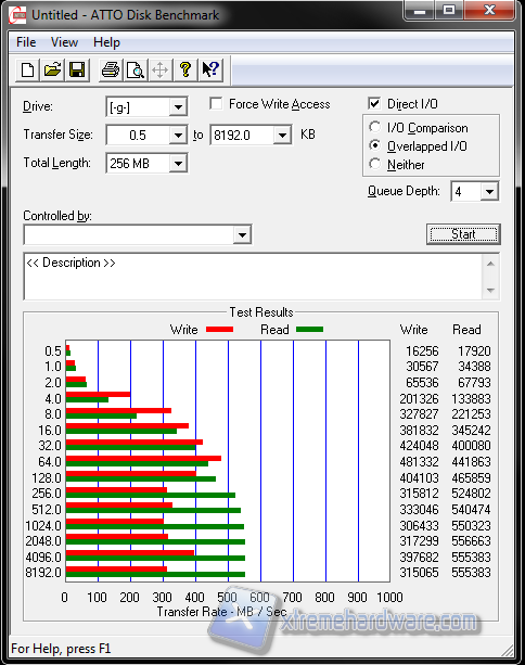 ATTO Disk Benchmark ci mostra invece dei risultati interessanti dove a seconda del tipo di dato, arriviamo in lettura a ben 555 MB/s, mentre in scrittura arriviamo ad un massimo di 400 MB/s circa.